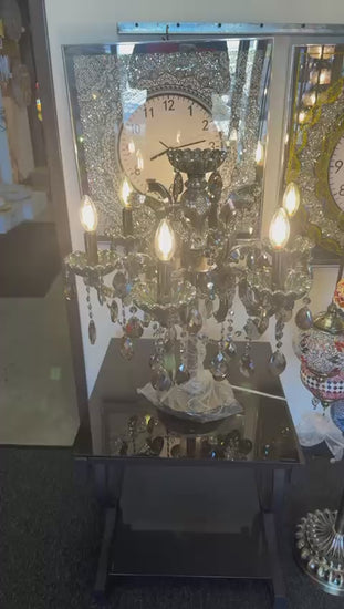 Elevate your décor with this stunning black crystal chandelier. Measuring 22" high and 25" wide, it features five candle-style lights and cascading faceted crystal drops for a dramatic sparkle. A striking blend of timeless elegance and contemporary style—perfect for adding luxury to any room or event.