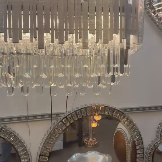 Make your space shine with this eye-catching rectangular crystal chandelier. With its clean chrome frame and cascading layers of shimmering crystals, it catches the light beautifully and adds just the right touch of glamour. Whether it’s hanging above a dining table or lighting up a living room, this piece brings a modern, luxurious feel to any room.
